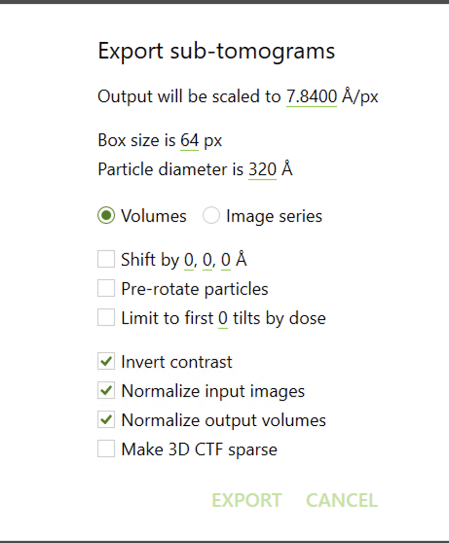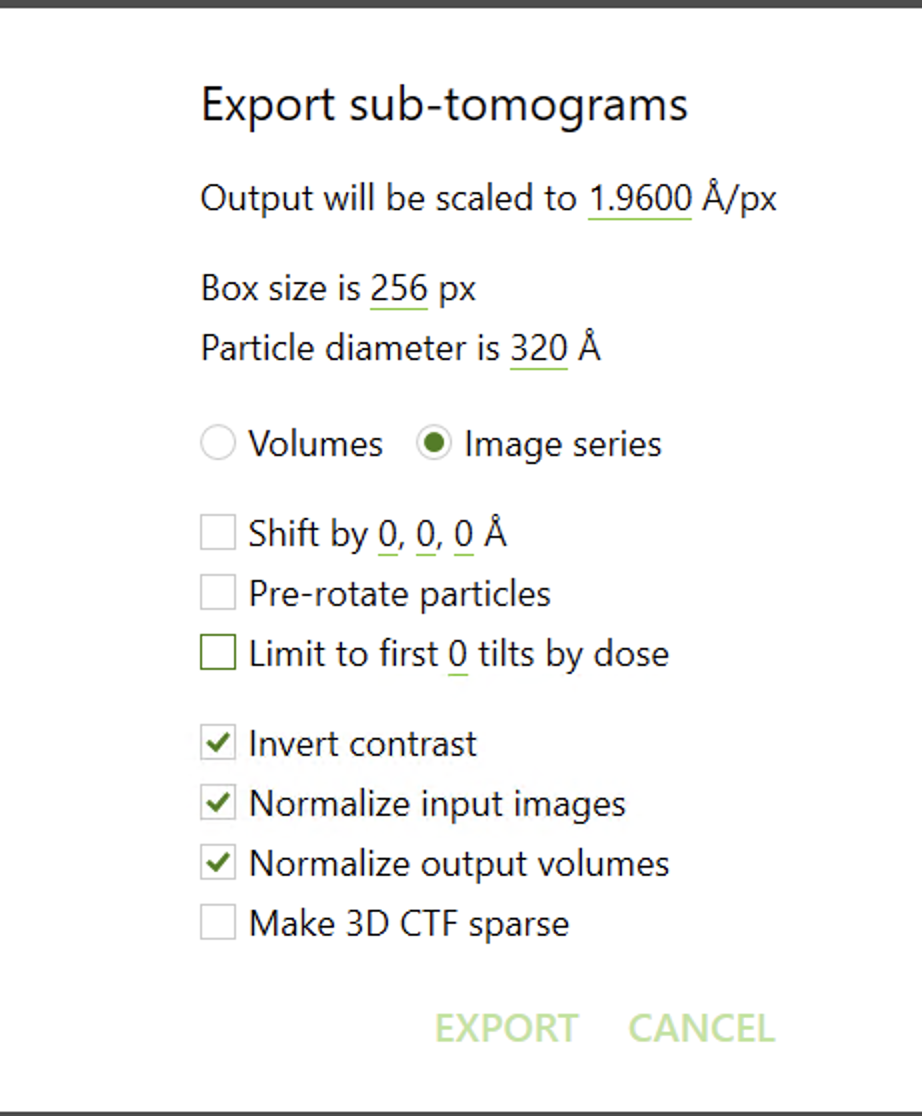 If you intend to perform subvolume refinement or tomogram visualization, we recommend also exporting highly binned subvolumes to generate a 3D star file at this stage, since additional Warp/M processing could result in particle reordering (!), which would affect downstream refinement if filtering with cryoDRGN-ET.
